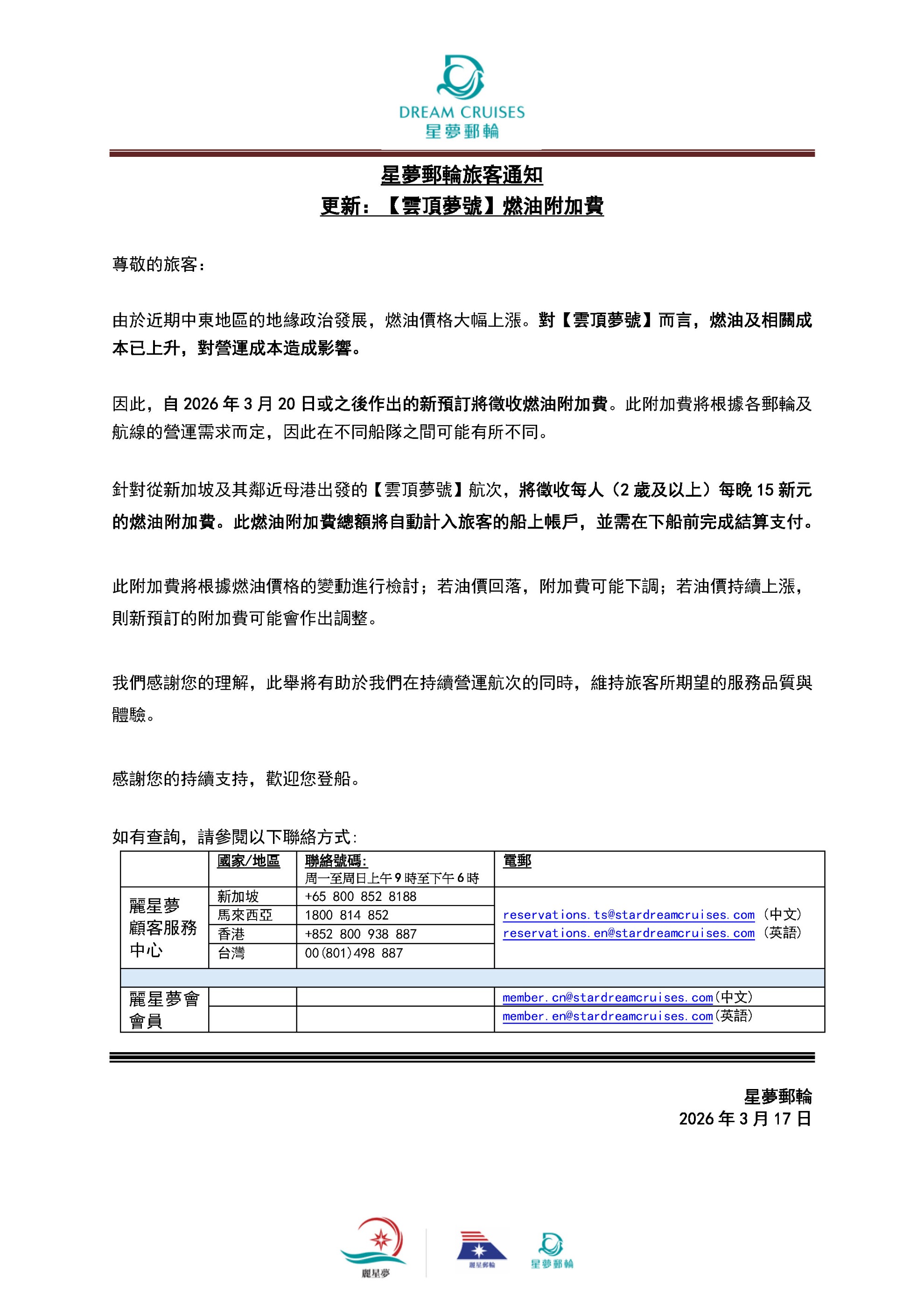 針對從新加坡及其鄰近母港出發的【雲頂夢號】航次,將徵收每人(2歲及以上)每晚15新元的燃油附加費。此燃油附加費總額將自動計入旅客的船上帳戶,並需在下船前完成結算支付。